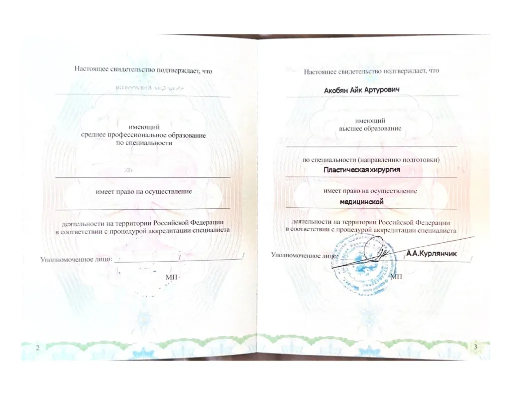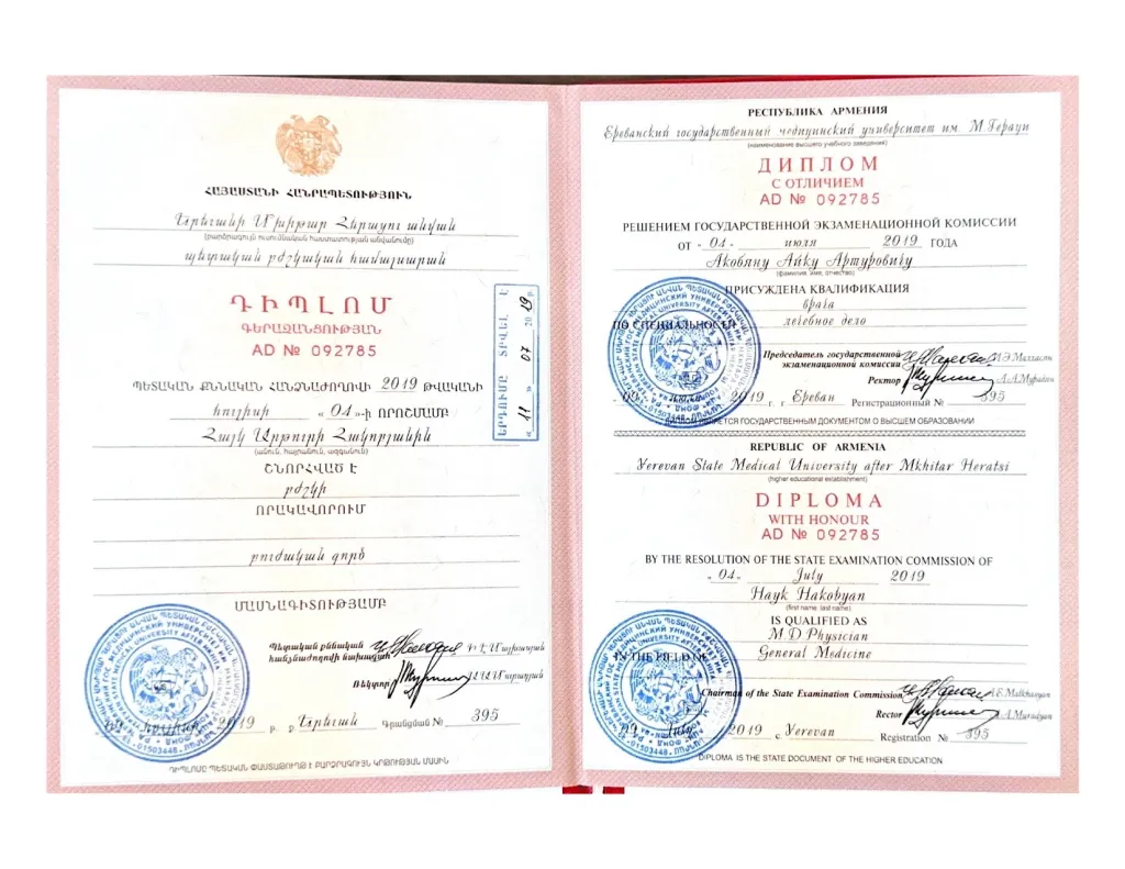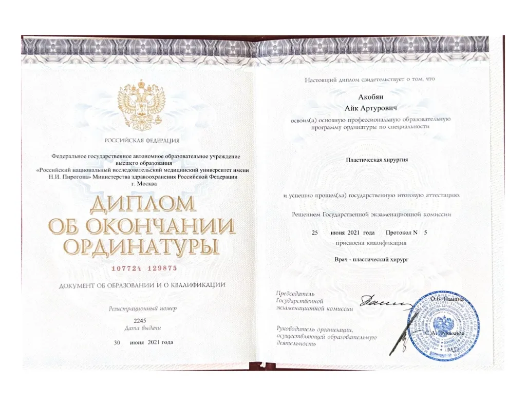 Окончил с отличием Ереванский государственный университет им. Мхитара Гераци по специальности «Лечебное дело» в 2019 году. Ординатуру успешно окончил в 2021 году в РНИМУ им. Н.И. Пирогова на базе Института Пластической Хирургии и Косметологии по специальности «Пластическая хирургия».