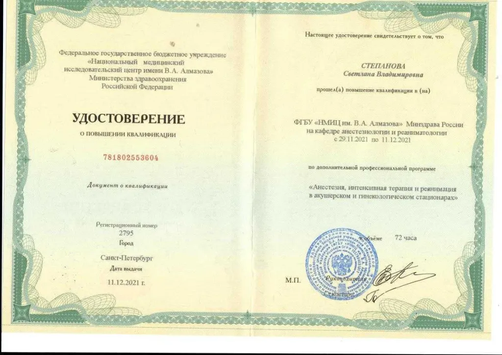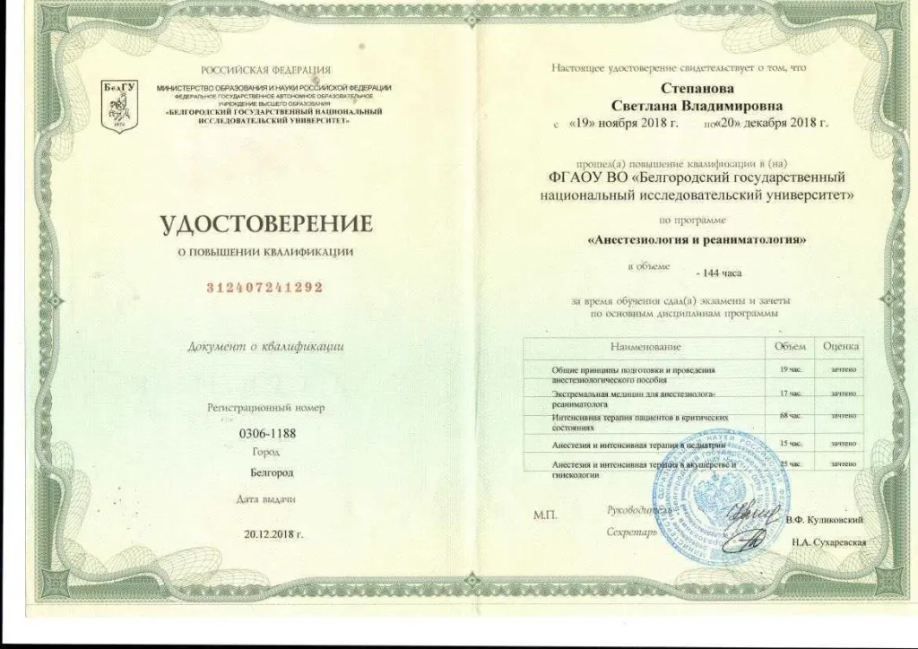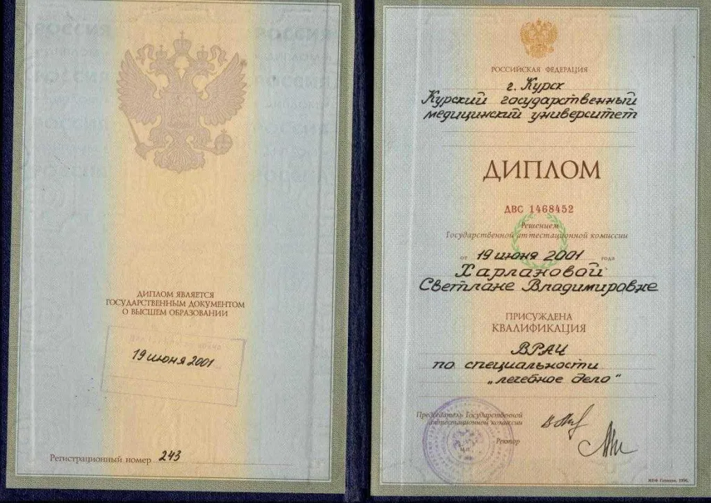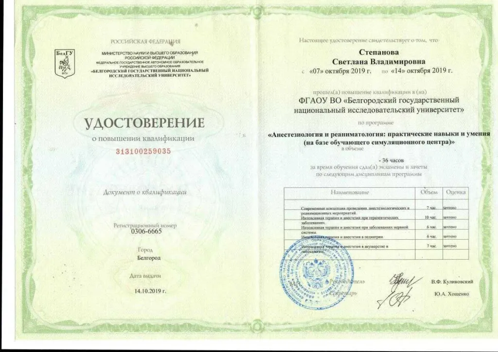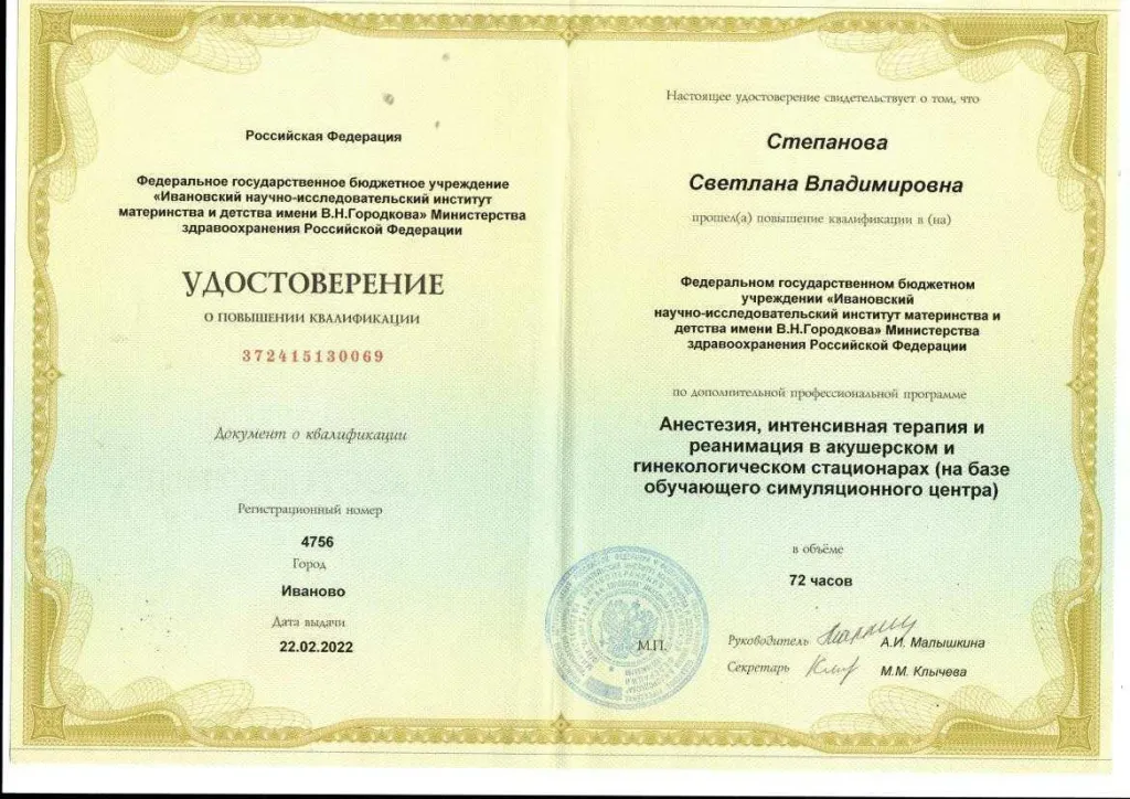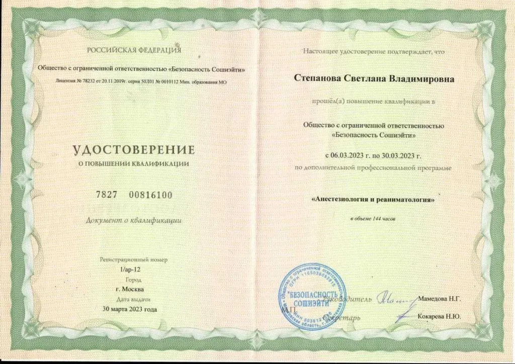 Закончила Курский государственный медицинский университет по специальности «Лечебное дело» (2001г.) в 2003 году окончила ординатуру по специальности «Анестезиология и реаниматология» в Курском государственном медицинском университете. Владеет всеми видами современного обезболивания и приемами сердечно-легочной реанимации, пункцией и катетеризацией центральных и периферических вен. Постоянно повышает свой теоретический и практический уровень. Член федерации анестезиологов-реаниматологов России. Большой опыт работы в акушерской анестезиологии. Имеет первую квалификационную категорию по специальности «Анестезиология и реаниматология» и сертификат специалиста.